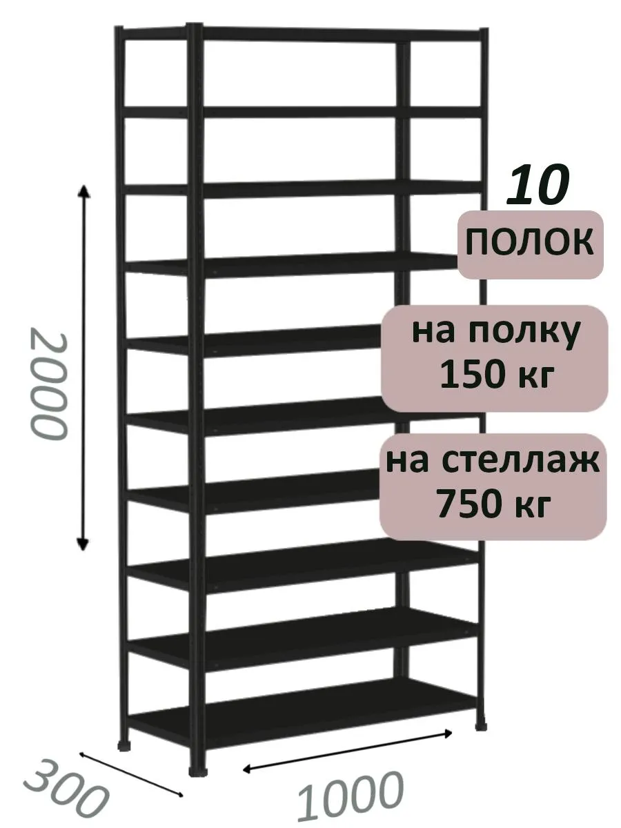 Стеллаж МС 2000х1000х300, 10 полок, чёрный