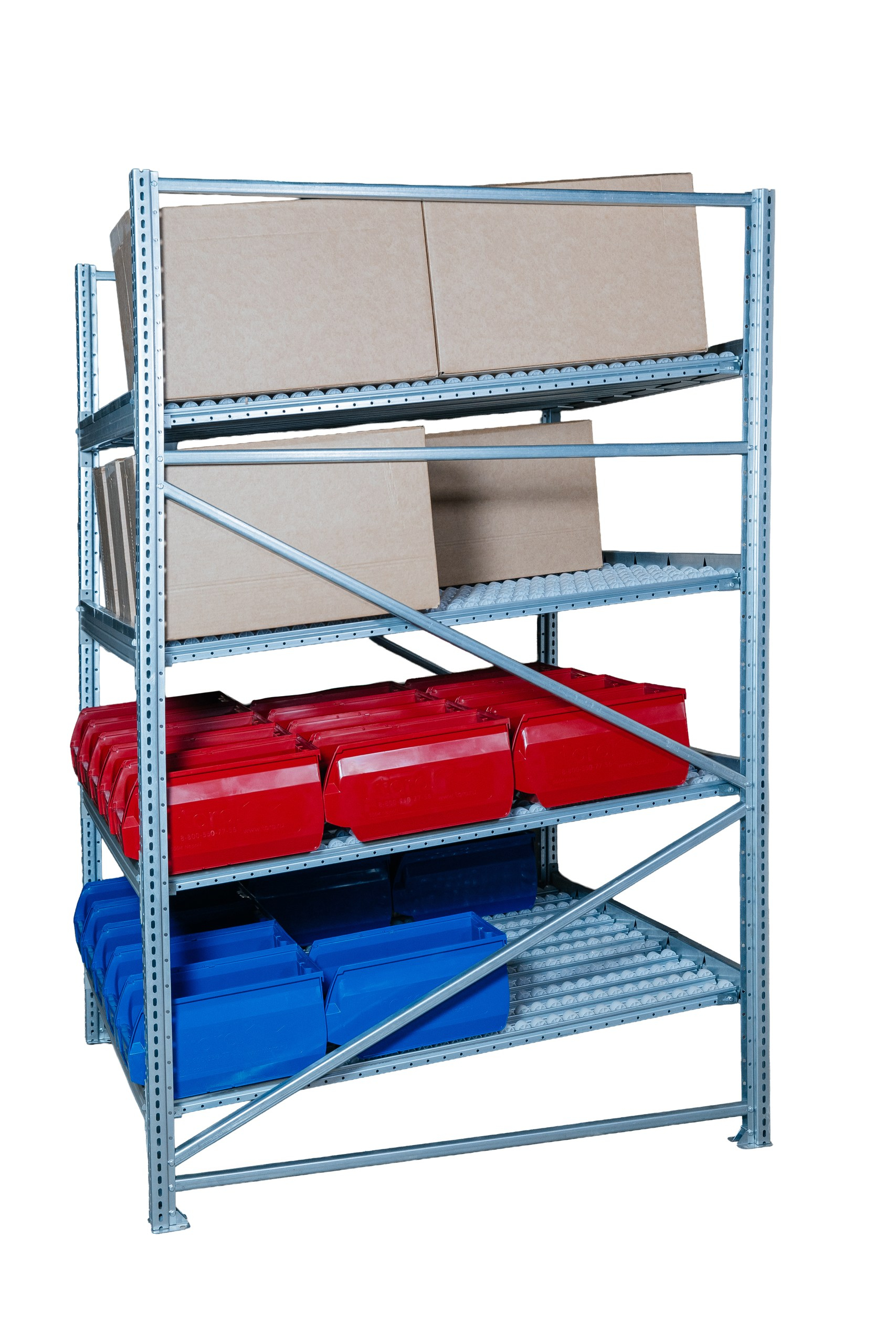 За счёт роликовых полок и наклонной подачи тары стеллаж поддерживает FIFO-принцип хранения, при котором загруженный товар последовательно перемещается к зоне отбора. Это позволяет ускорить комплектацию заказов, повысить наглядность размещения продукции и оптимизировать использование рабочего пространства.