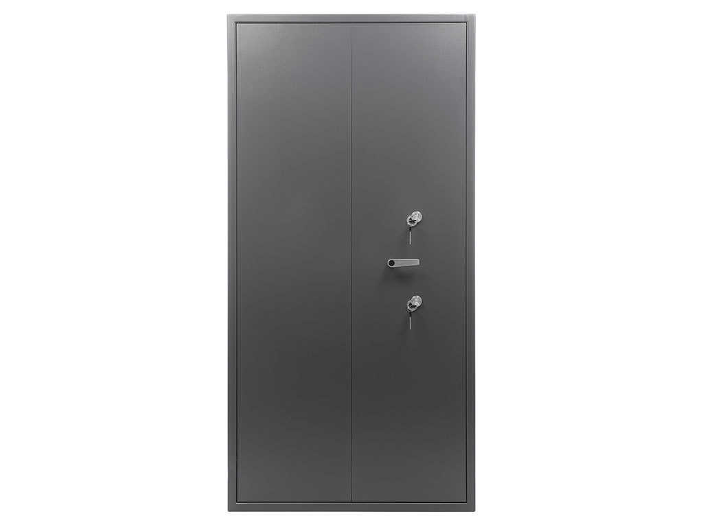 - Комплектуются двумя ключевыми сувальдными замками класс 2 ГОСТ 5089-2011 (по 2 ключа от каждого замка в комплекте) с опечатывающими устройствами. Поворотная ручка для удобства открывания и закрывания. Левая створка двери оборудована двумя подпружиненными самозапирающимися защелками (вверх и вниз) с приводом от ручки находящейся на внутренней стороне створки двери