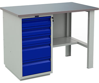 - Верстак окрашен порошковой краской, цвет покрытия корпуса серый шагрень (RAL 7038), лицевая панель дверцы тумбы – синий шагрень (RAL 5002)