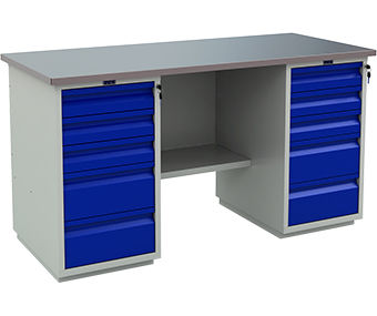 - Верстак состоит из 2 тумб WD5. Тумба укомплектована 5-ю выдвижными ящиками. Ящики открываются на телескопических направляющих. Нагрузка на ящик 30 кг. Все ящики закрываются на центральный ключевой замок.