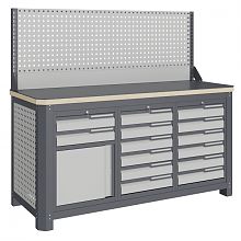 Верстак серии MECHANIC: MCN 2052.S68.11 состоит из столешницы шириной 1993 мм, рамы верстака, состоящей из опор, перемычек, боковых перфопанелей, малых модулей S6, S8 и двух комплектов полка-стенка SW1.