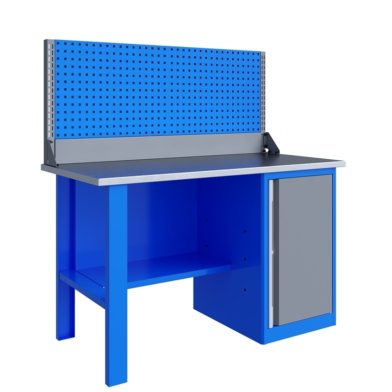 Верстак серии Technic 141.17.2-1 состоит из столешницы шириной 1396 мм, опоры, тумбы P7 с дверью и двумя полками, полки-стенки и одинарного экрана с кронштейнами.