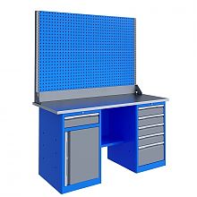 Верстак серии Technic 201.56.3-2 состоит из столешницы шириной 1996 мм, тумбы P5 с четырьмя малыми и одним большим ящиком, тумбы P6 с шестью малыми ящиками, полки-стенки, двойного экрана с кронштейнами Предназначен для выполнения сборочных, ремонтных, слесарных, монтажных и других видов работ на производстве, в сервисных центрах, мастерских, гаражах, а также для обучения технологии в учебных заведениях